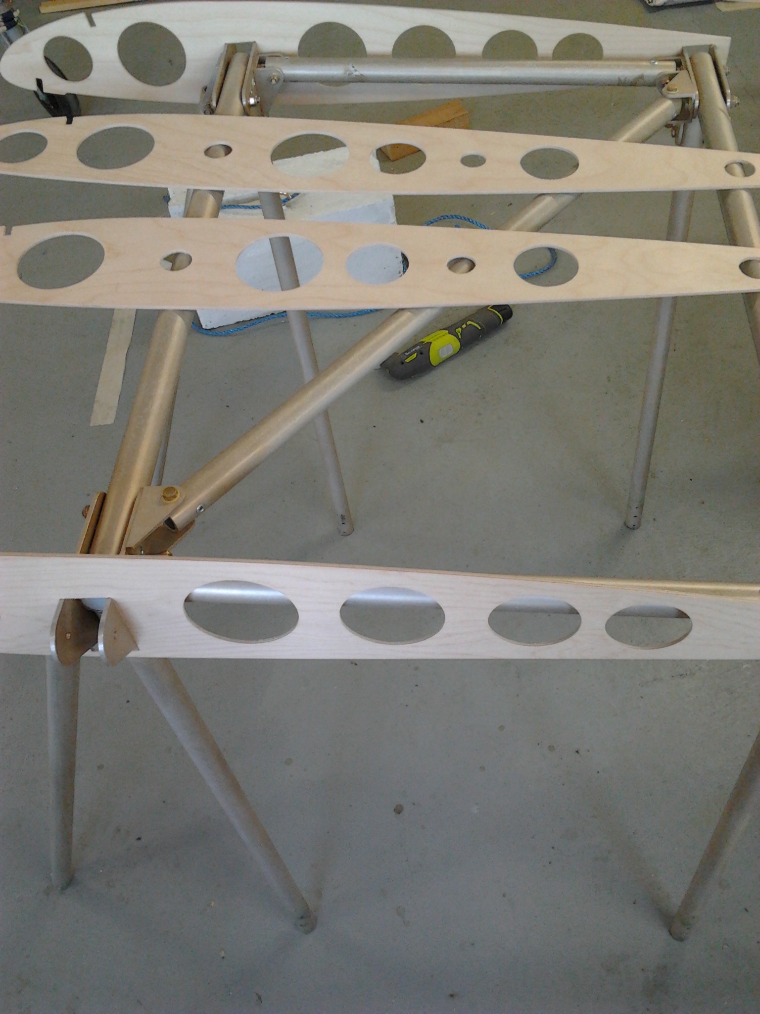 - Ailerons – First (Lower Left) underway with rib location marked on spar, ready to tag glue then fibreglass