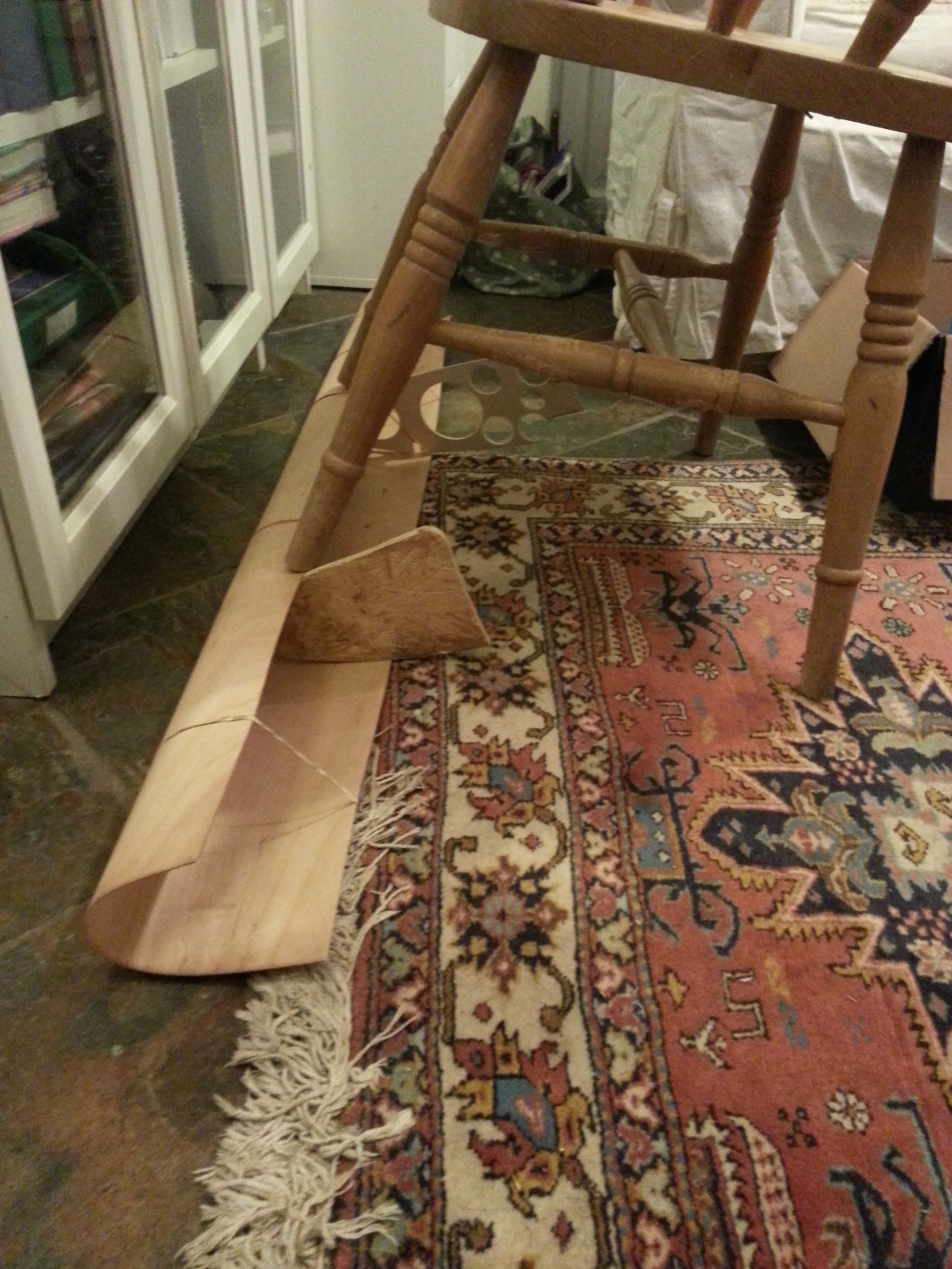 As you can see – with a bit of ingenuity – rubber bands and a chair of just the right weith to hold but not squash … This morning its dry and pretty much fully formed so should be much simpler to hold around the profiled leading edge whilst the Aerolite glue takes.
