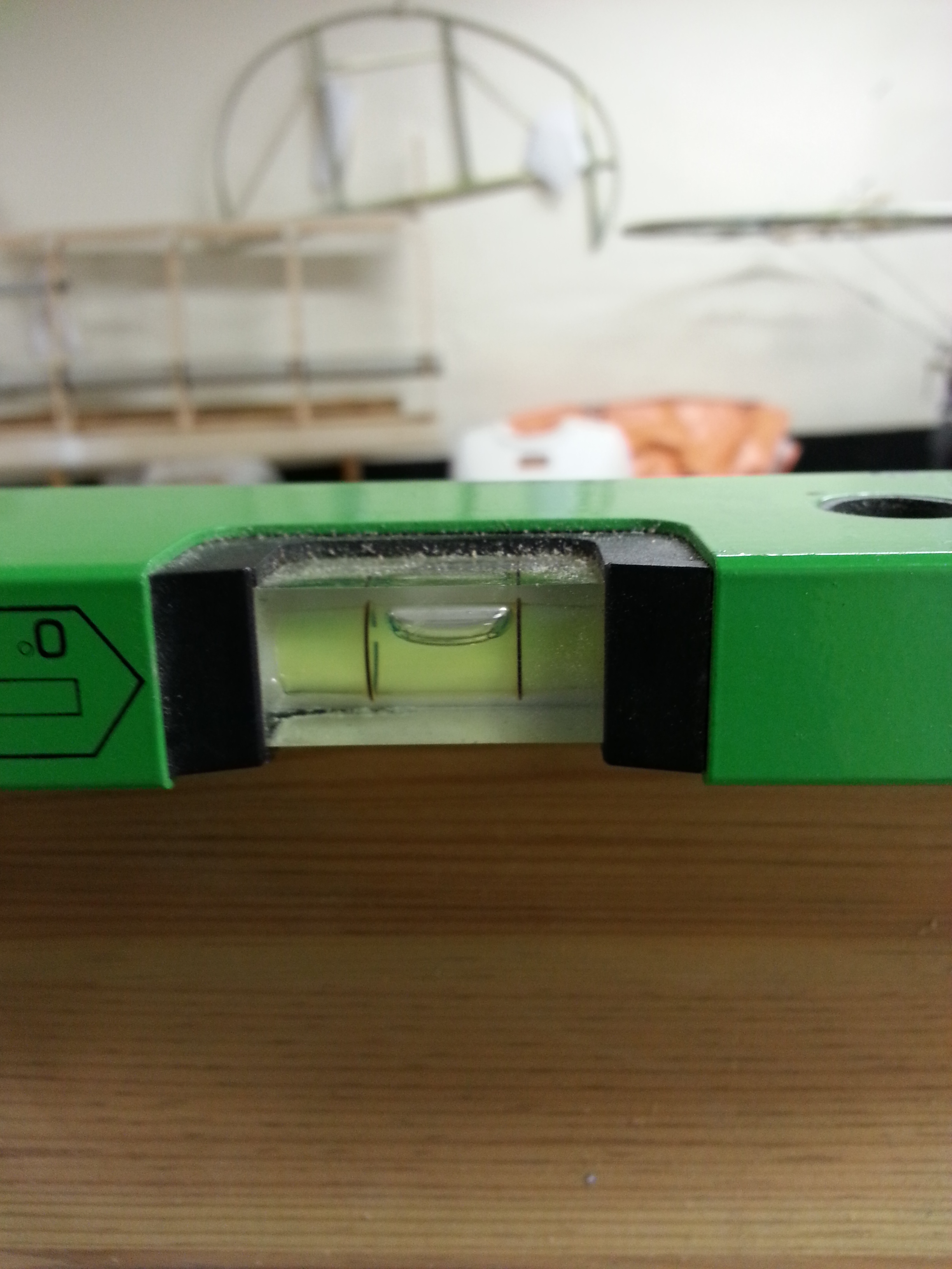 A chunky (not flexing) dihedral board has been made up and needs to be long enough to span 3 ribs to ensure you get a measured / accurate slope. With a 3 degree slope cut in the bottom – and placed the CORRECT ! way around, a spirit level on top should read zero.