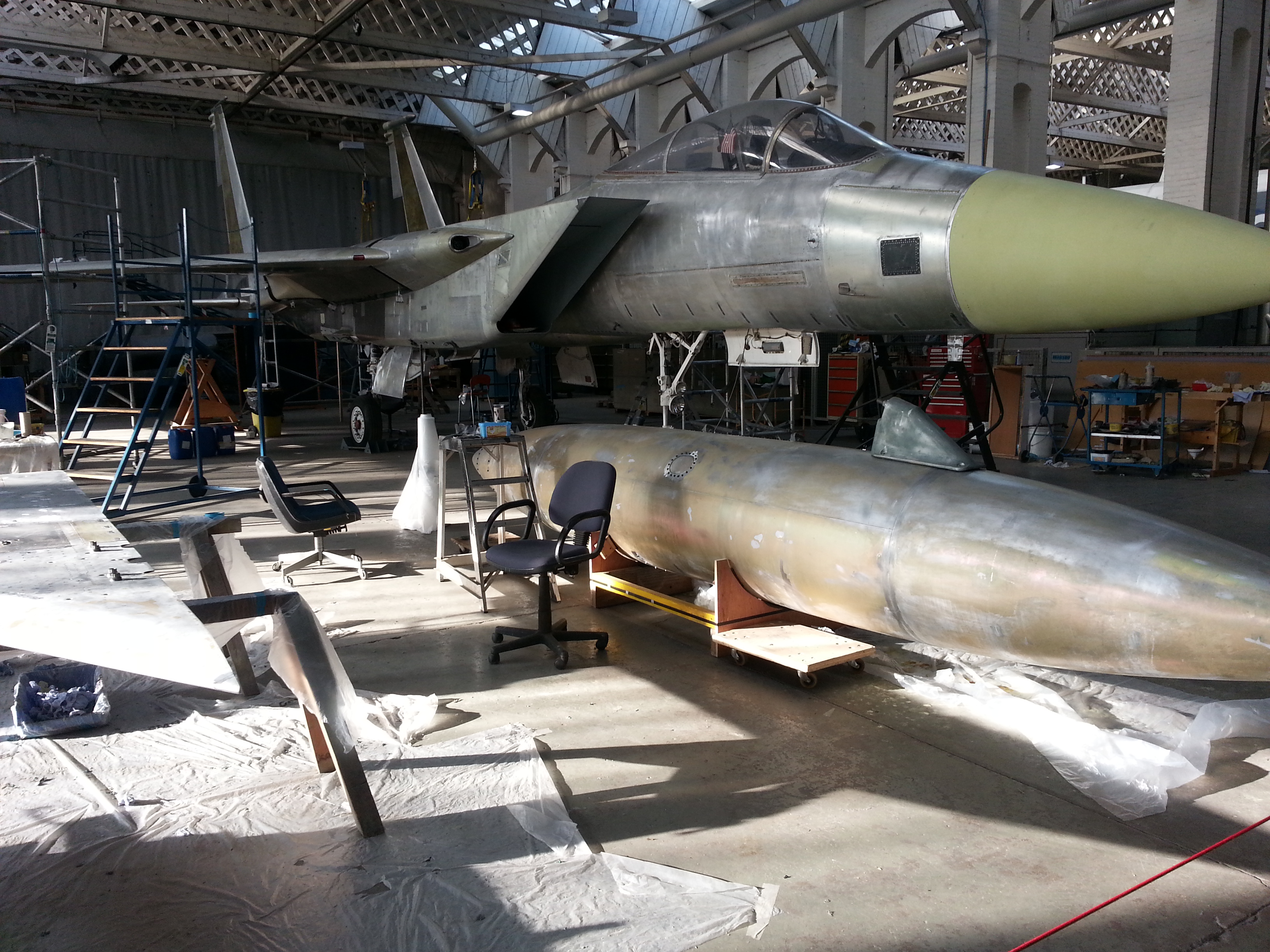 Nipped into Hanger 5 to see what was being worked on … paint job on the F15 makes my decking look tame ! also the split Mustang cradle was neat