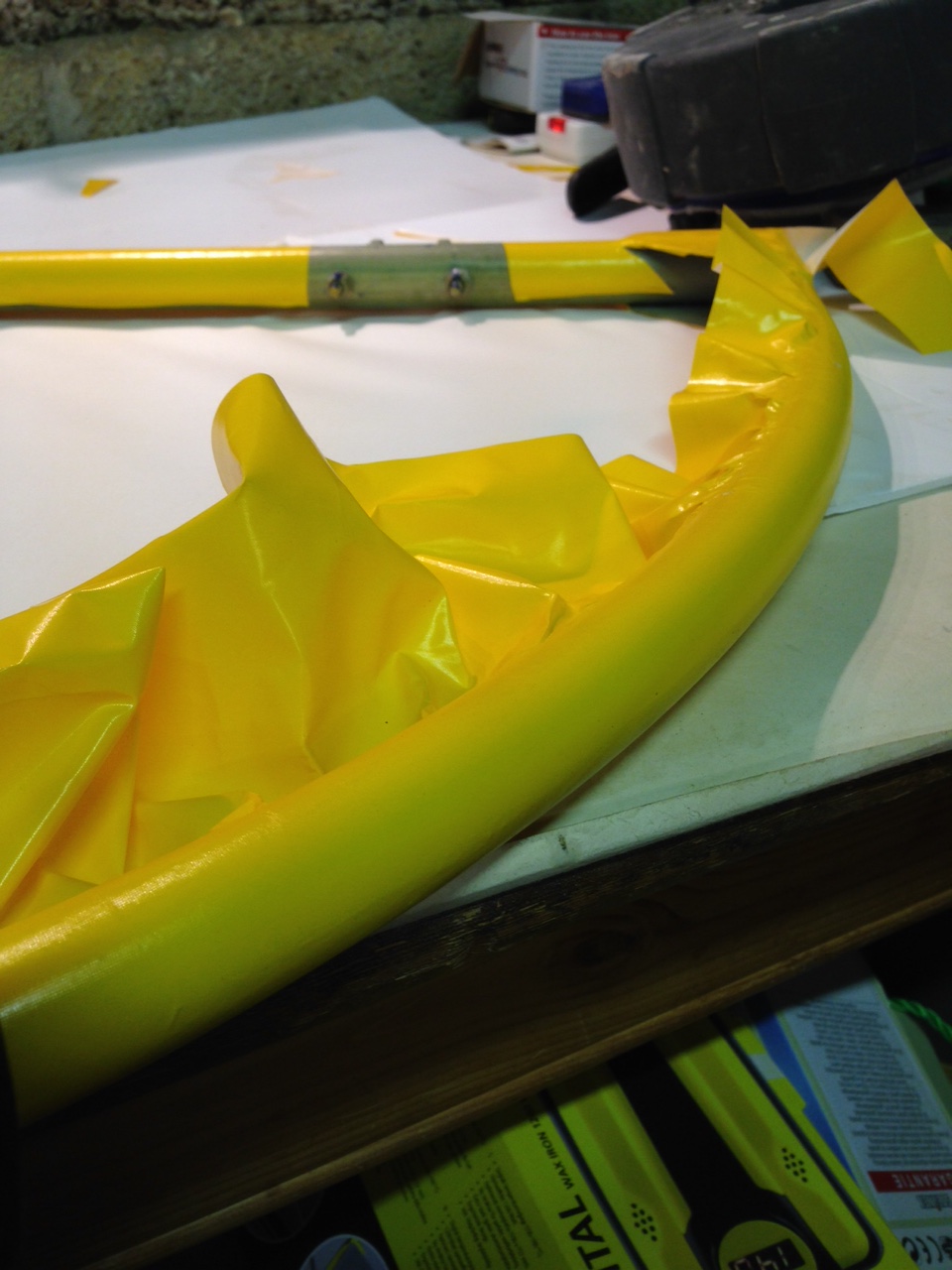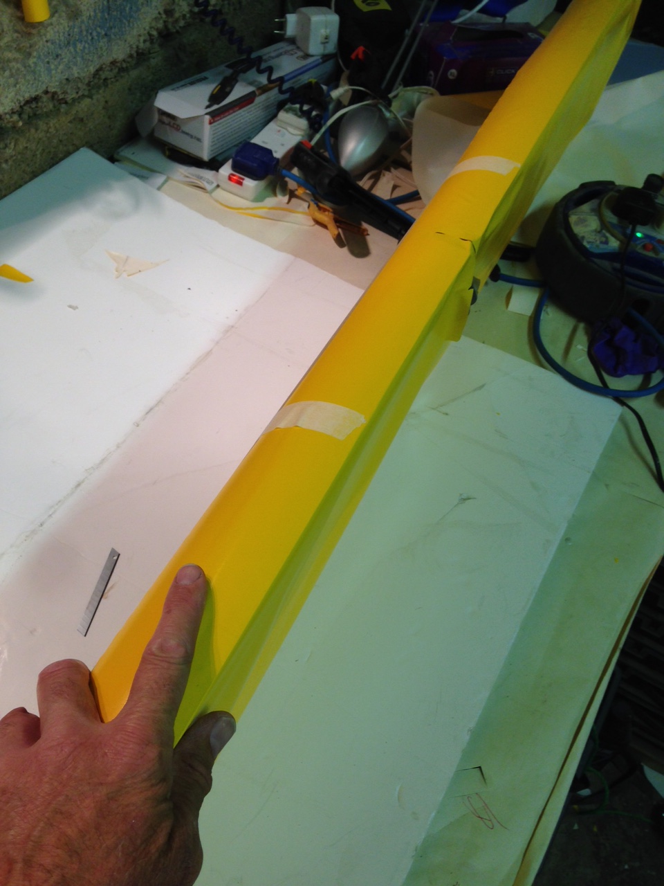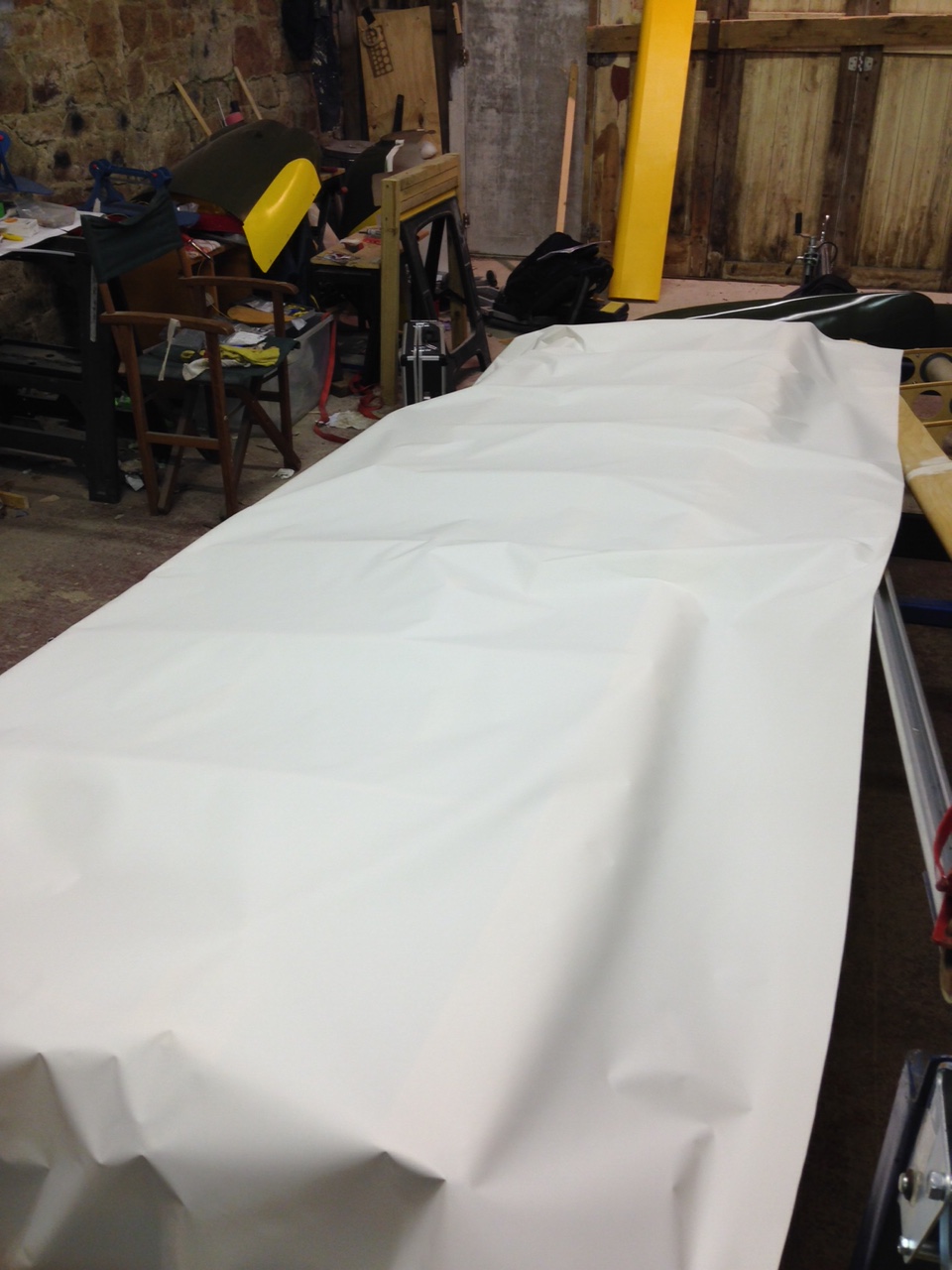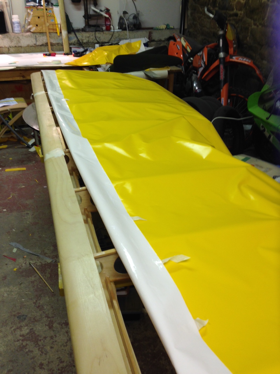So I took the big 1.8m roll of Oratex out of its protective covering and unrolled it over the prepared underside of the Top Port wing. Trimmed to length and let it hang out over the sides. You then need to set an alignment level on the leading edge .. following PHS expert advice 🙂