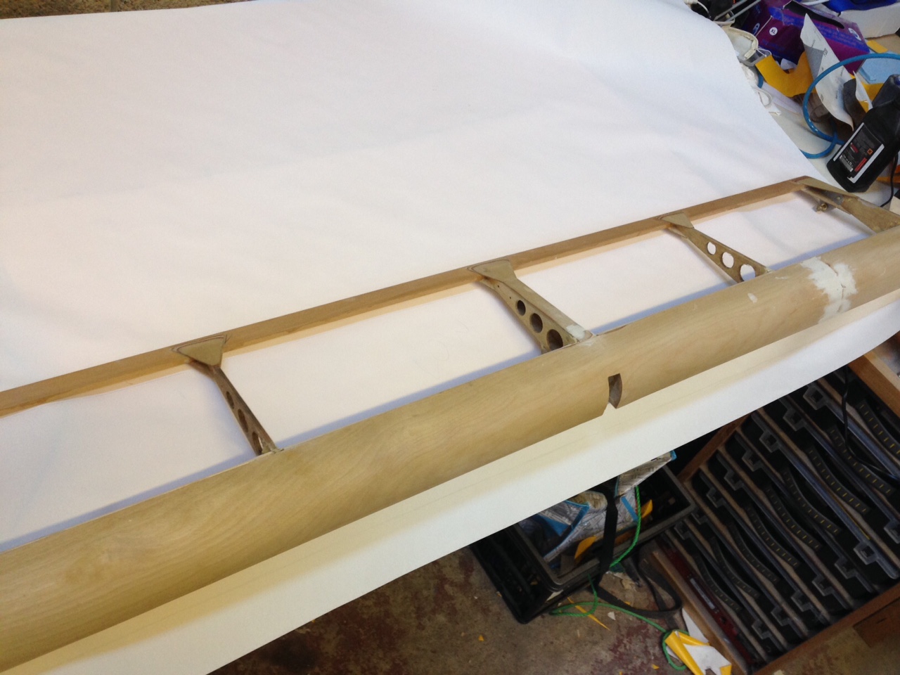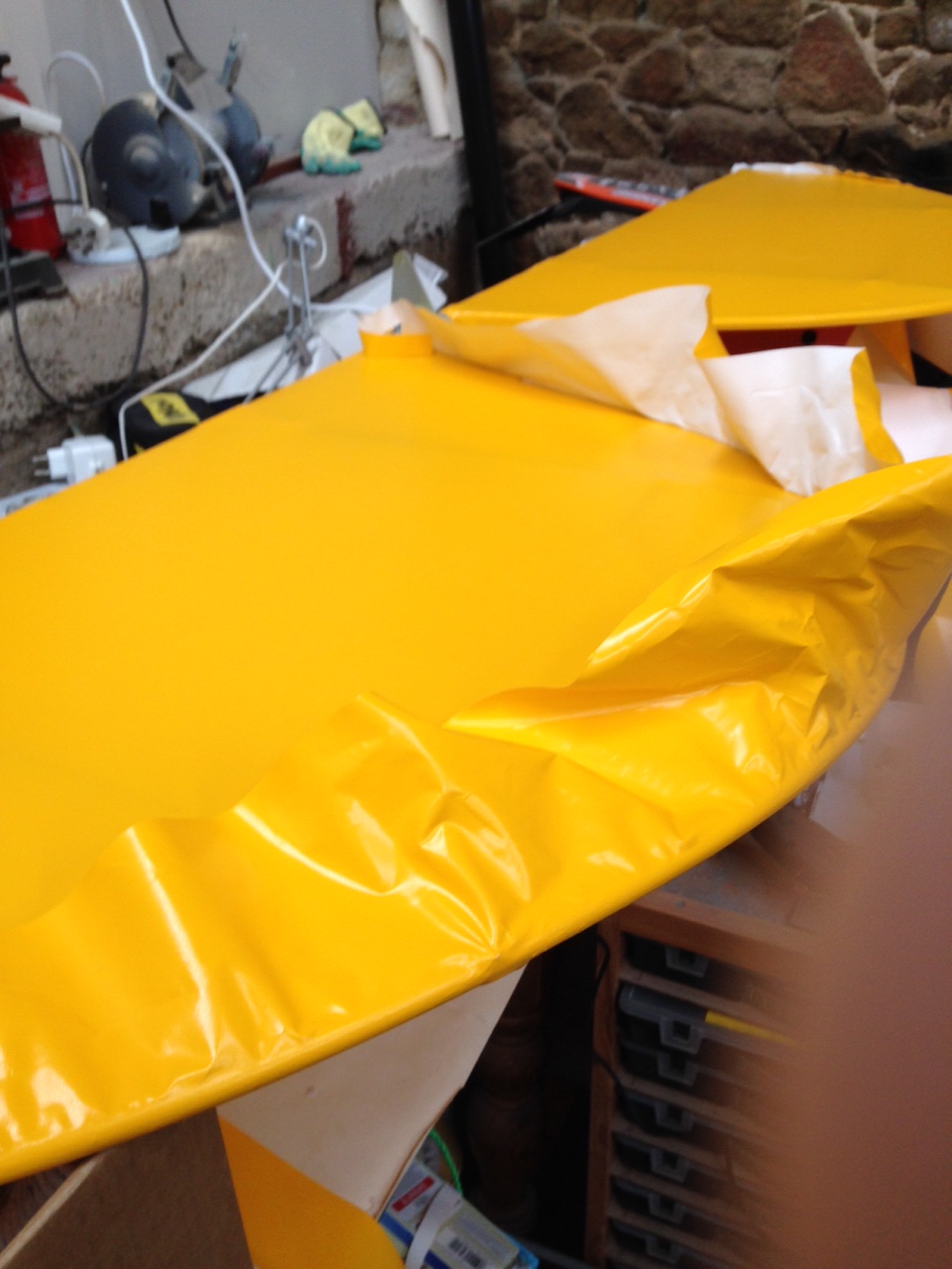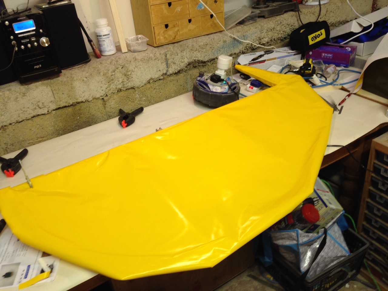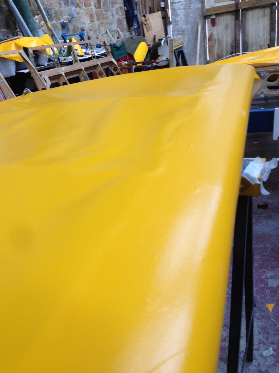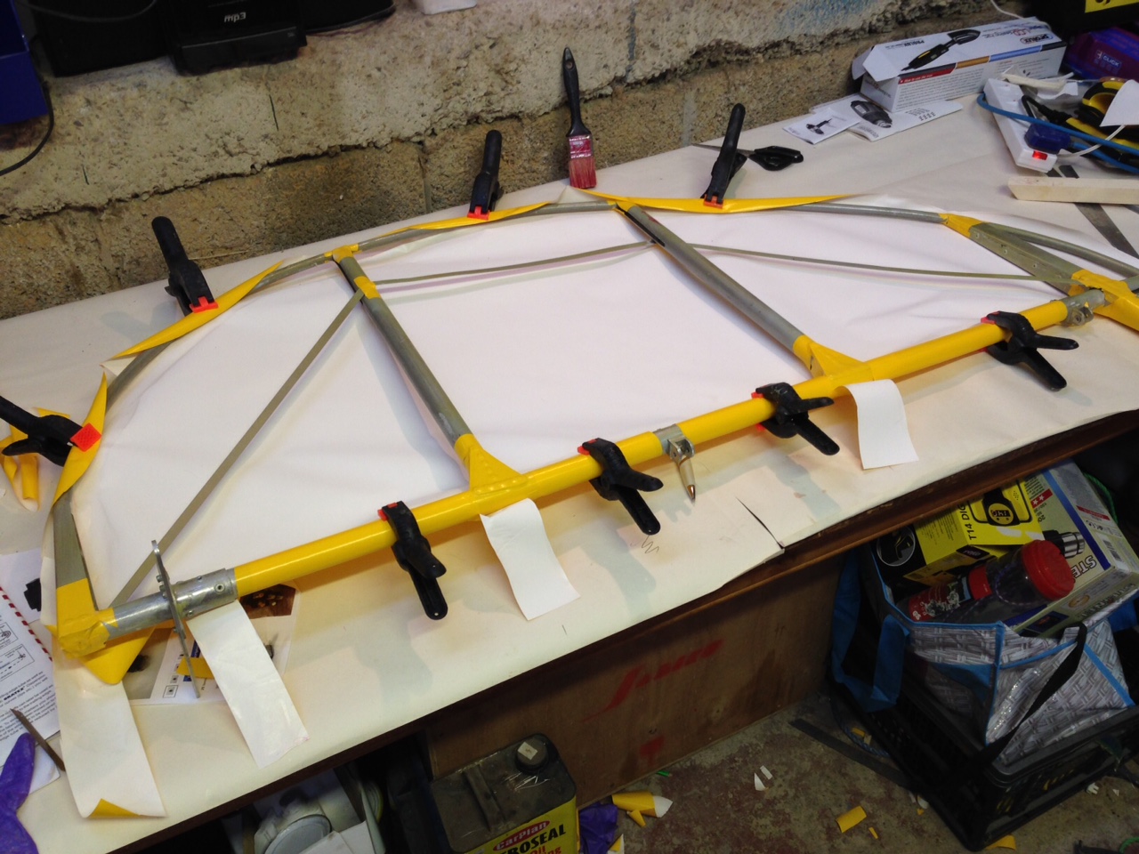 So I took the big 1.8m roll of Oratex out of its protective covering and unrolled it over the prepared underside of the Top Port wing. Trimmed to length and let it hang out over the sides. You then need to set an alignment level on the leading edge .. following PHS expert advice 🙂
