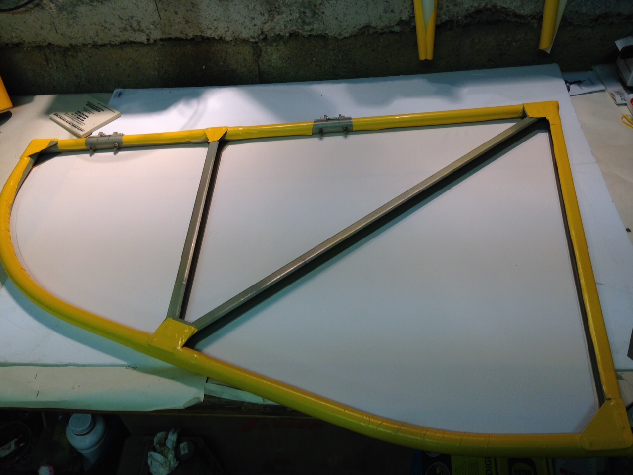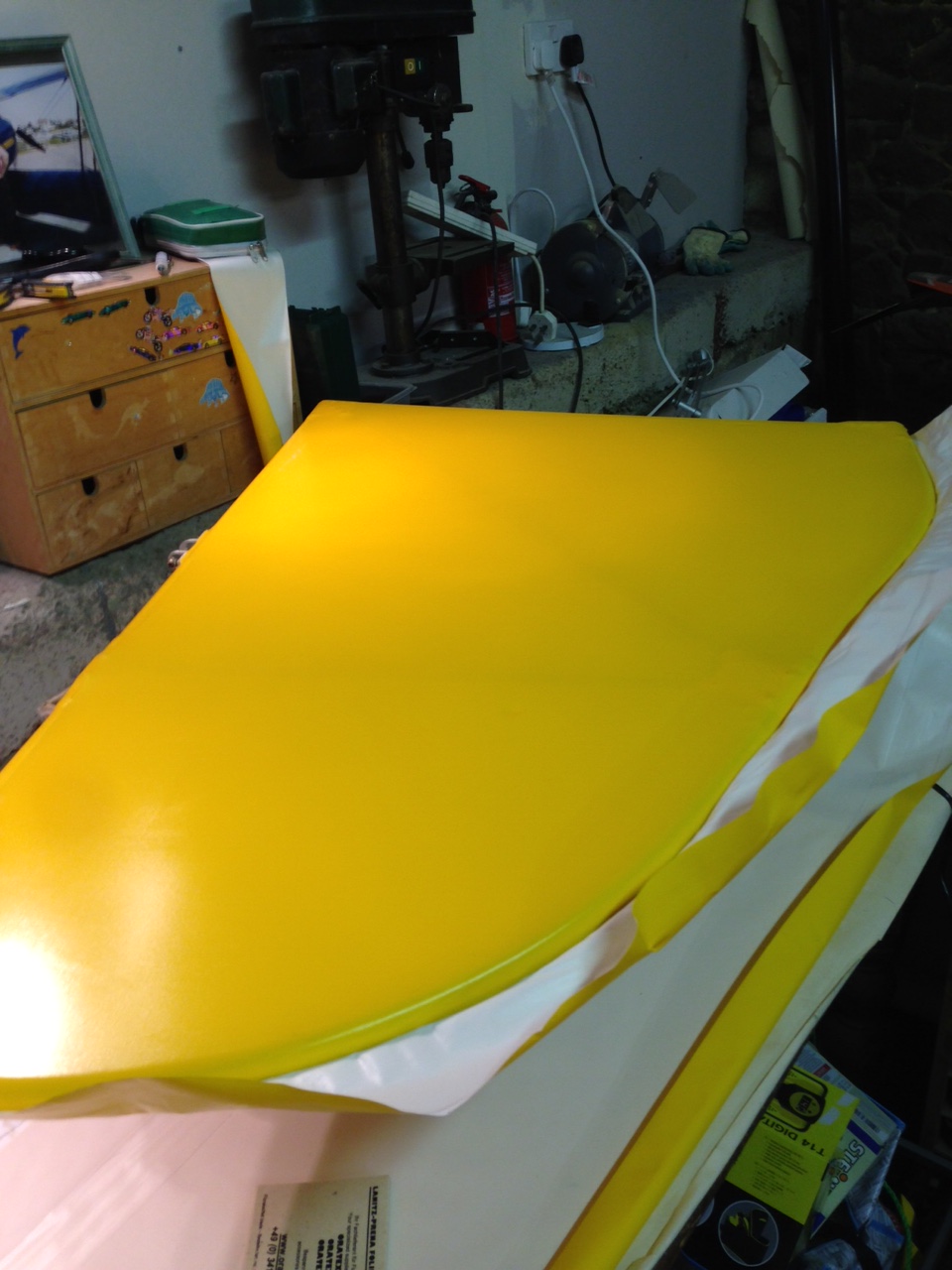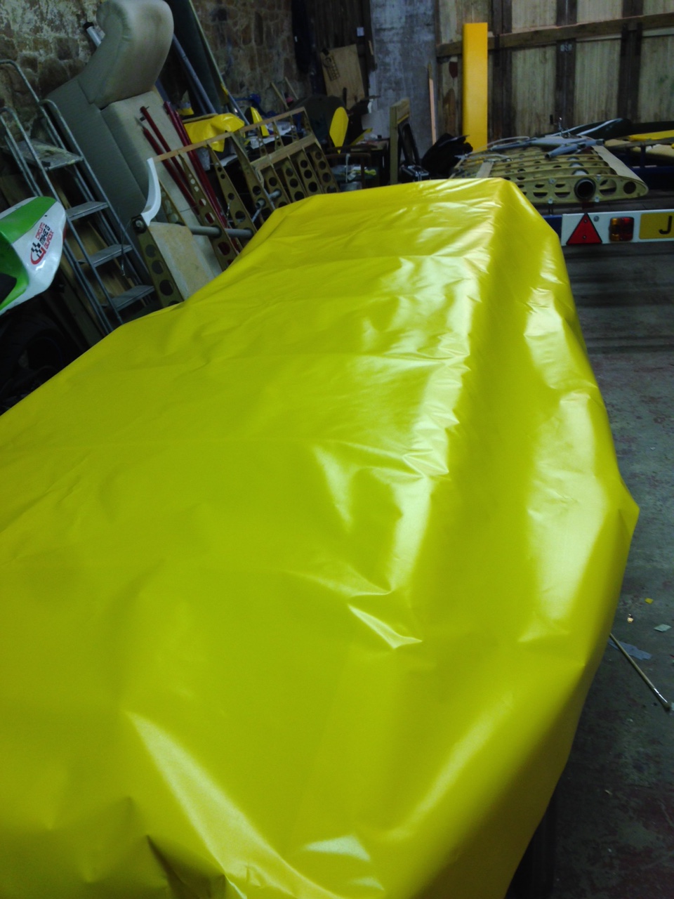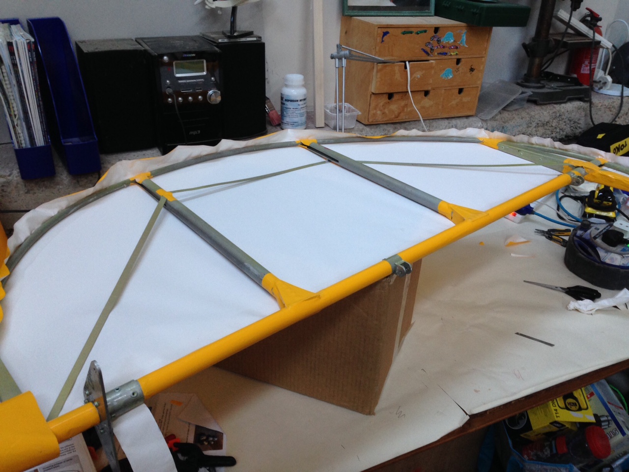 So I took the big 1.8m roll of Oratex out of its protective covering and unrolled it over the prepared underside of the Top Port wing. Trimmed to length and let it hang out over the sides. You then need to set an alignment level on the leading edge .. following PHS expert advice 🙂