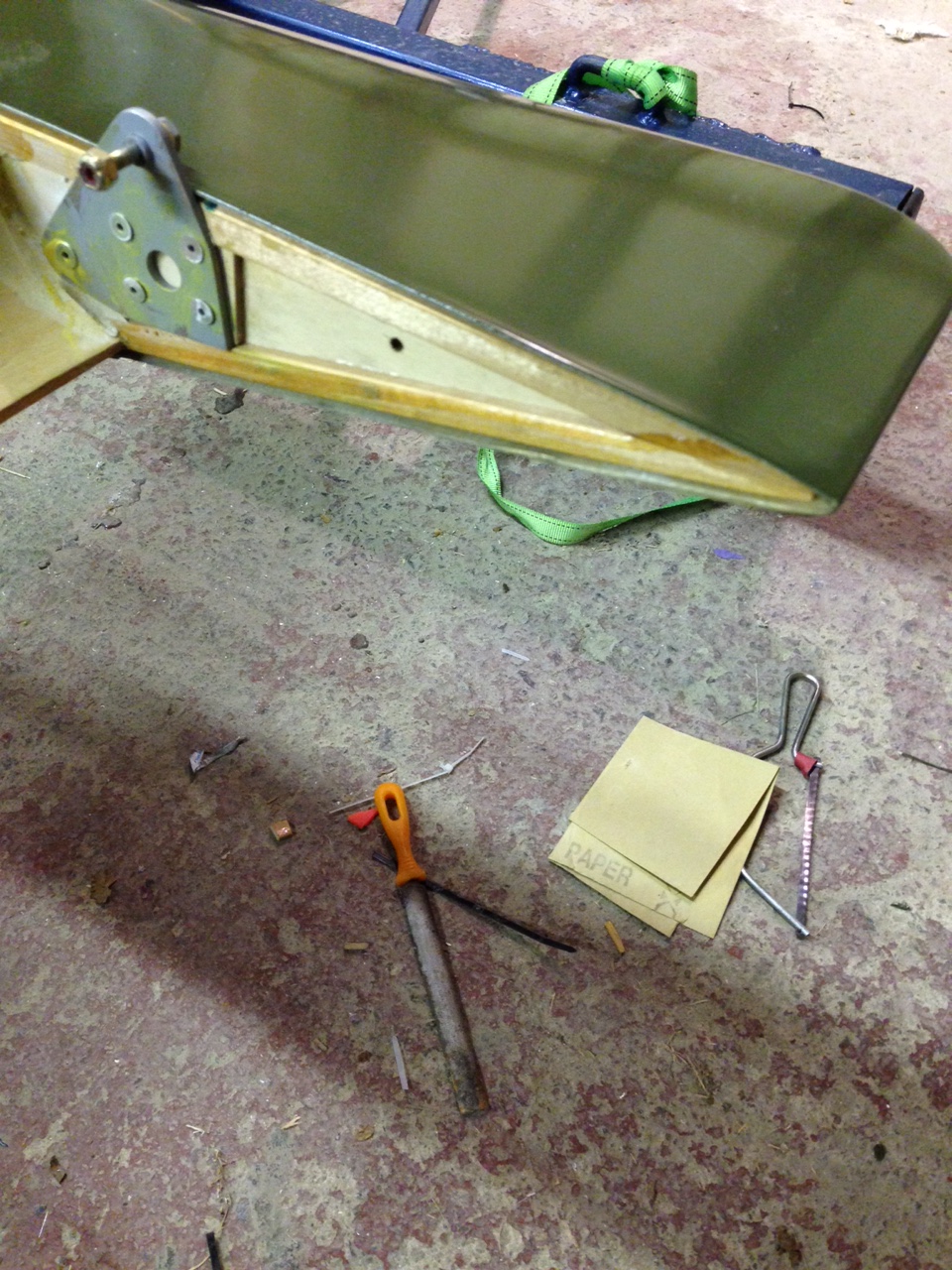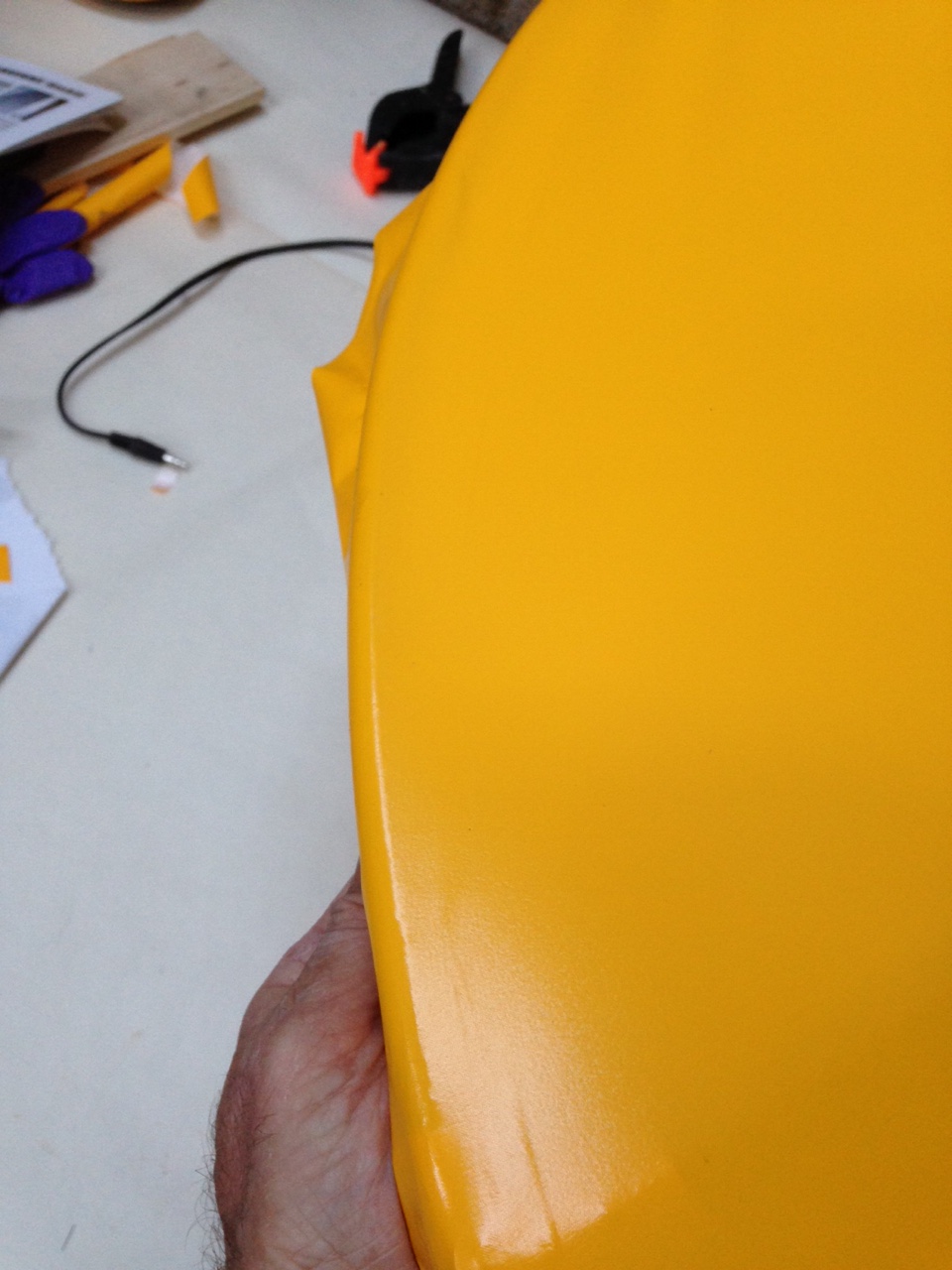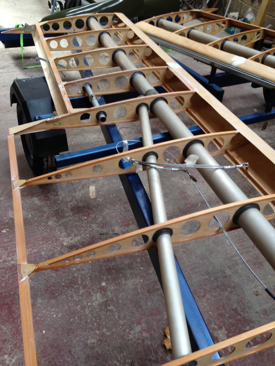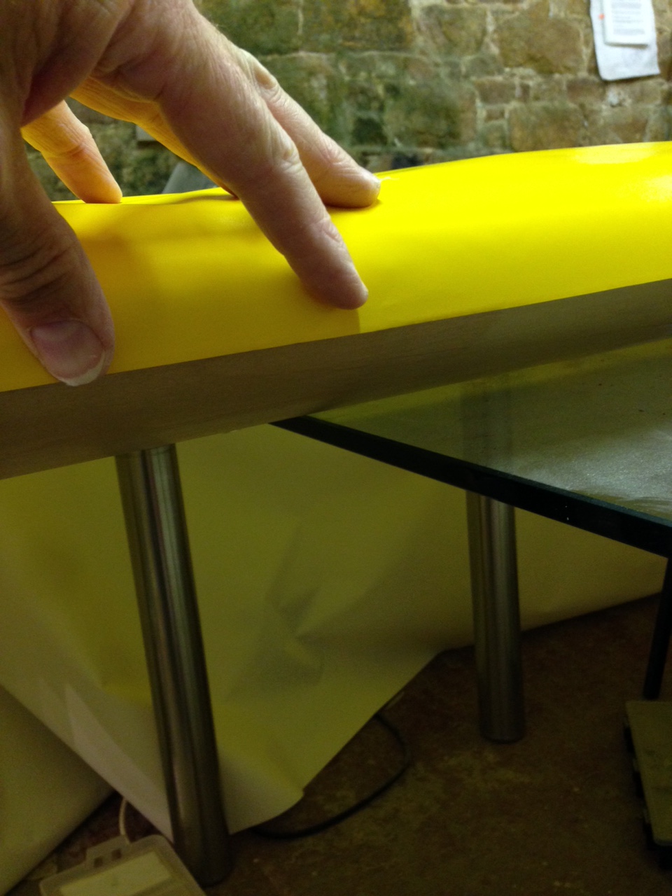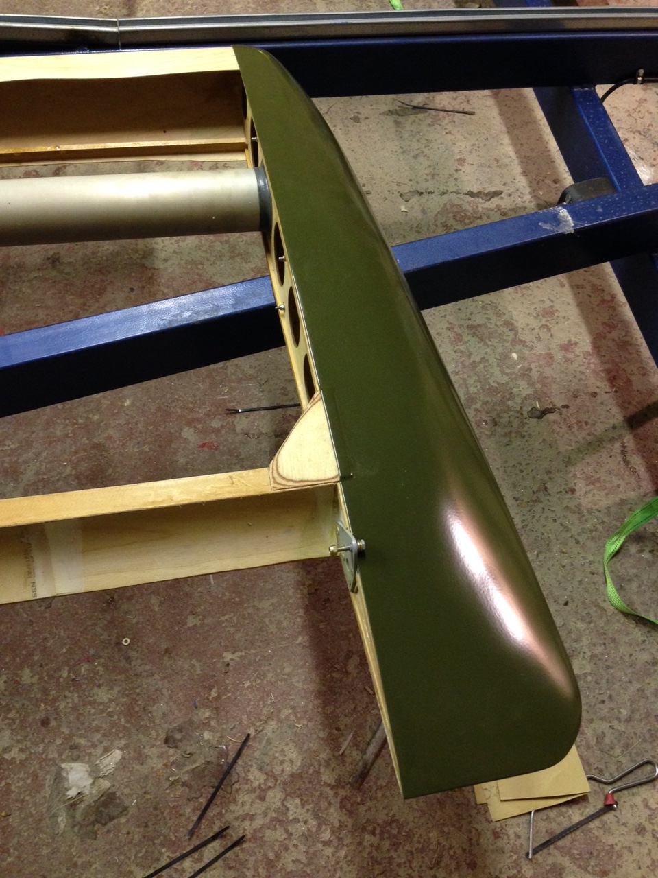 So I took the big 1.8m roll of Oratex out of its protective covering and unrolled it over the prepared underside of the Top Port wing. Trimmed to length and let it hang out over the sides. You then need to set an alignment level on the leading edge .. following PHS expert advice 🙂