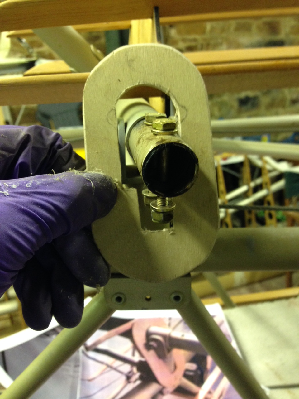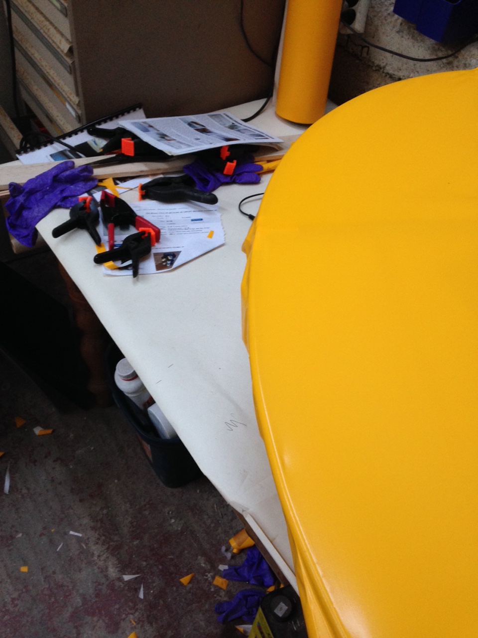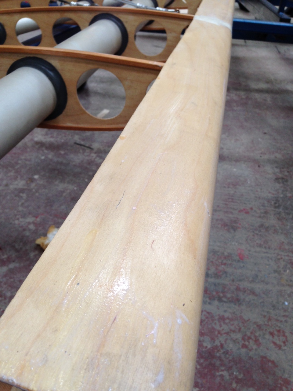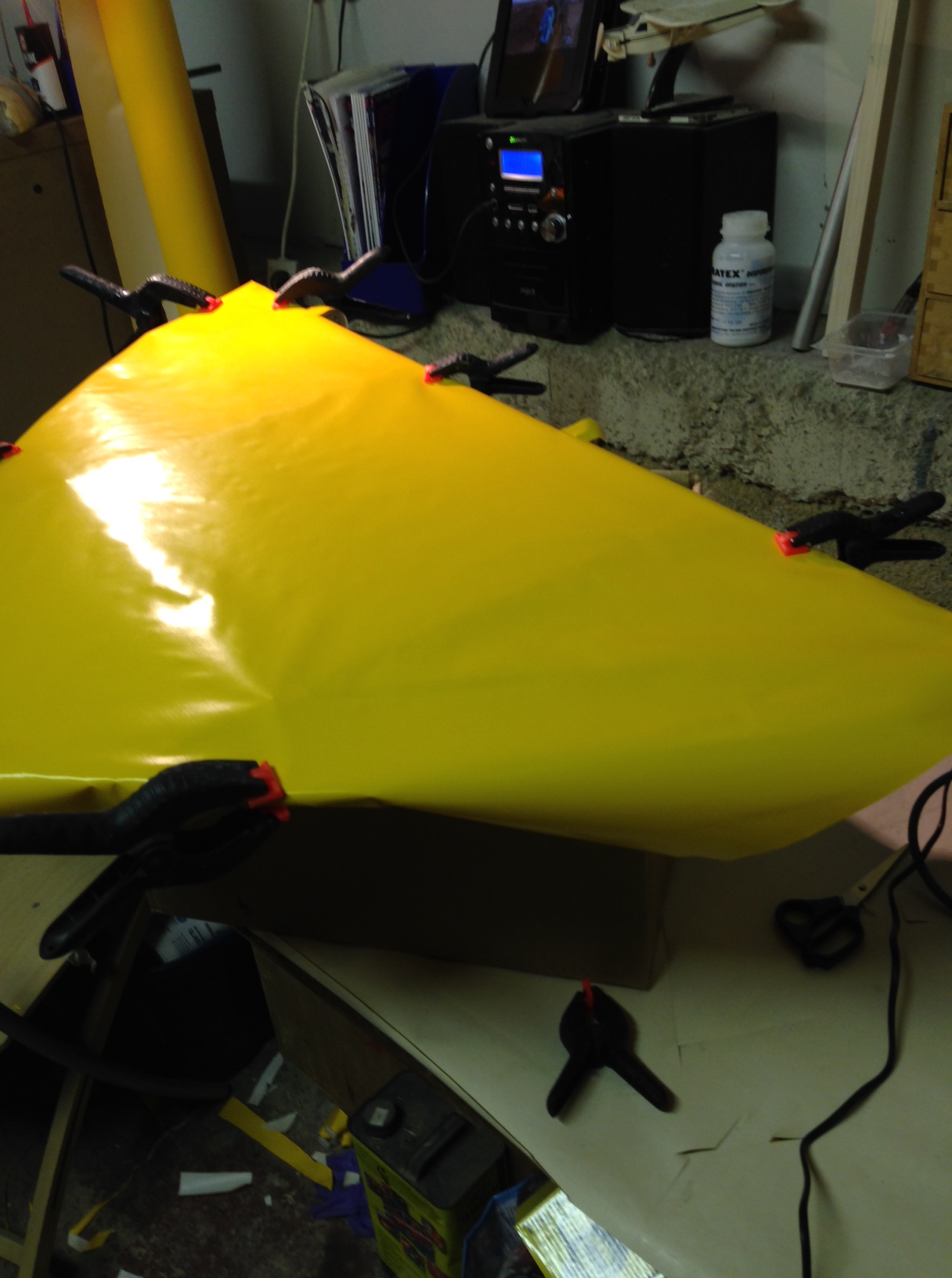 So I took the big 1.8m roll of Oratex out of its protective covering and unrolled it over the prepared underside of the Top Port wing. Trimmed to length and let it hang out over the sides. You then need to set an alignment level on the leading edge .. following PHS expert advice 🙂