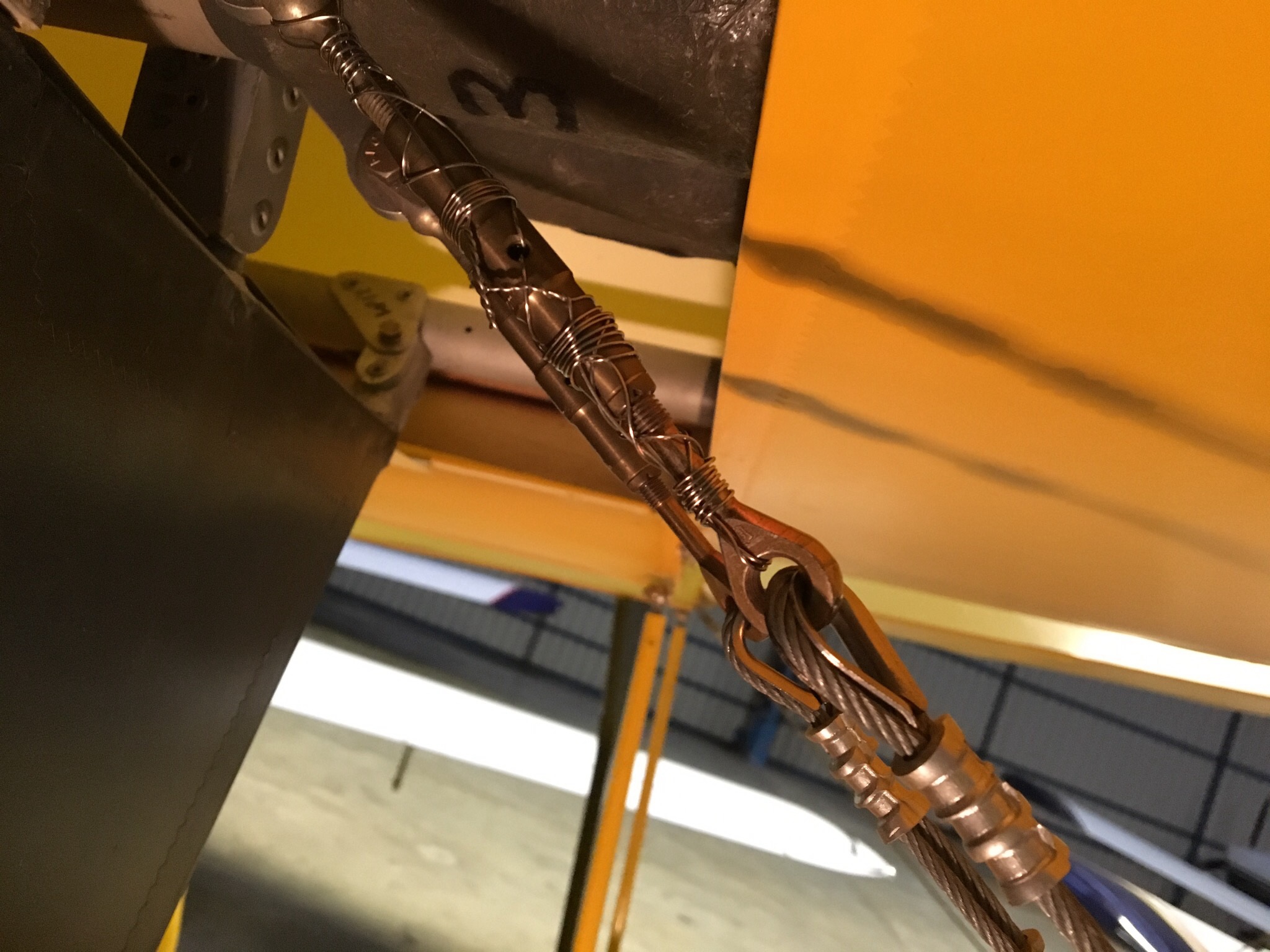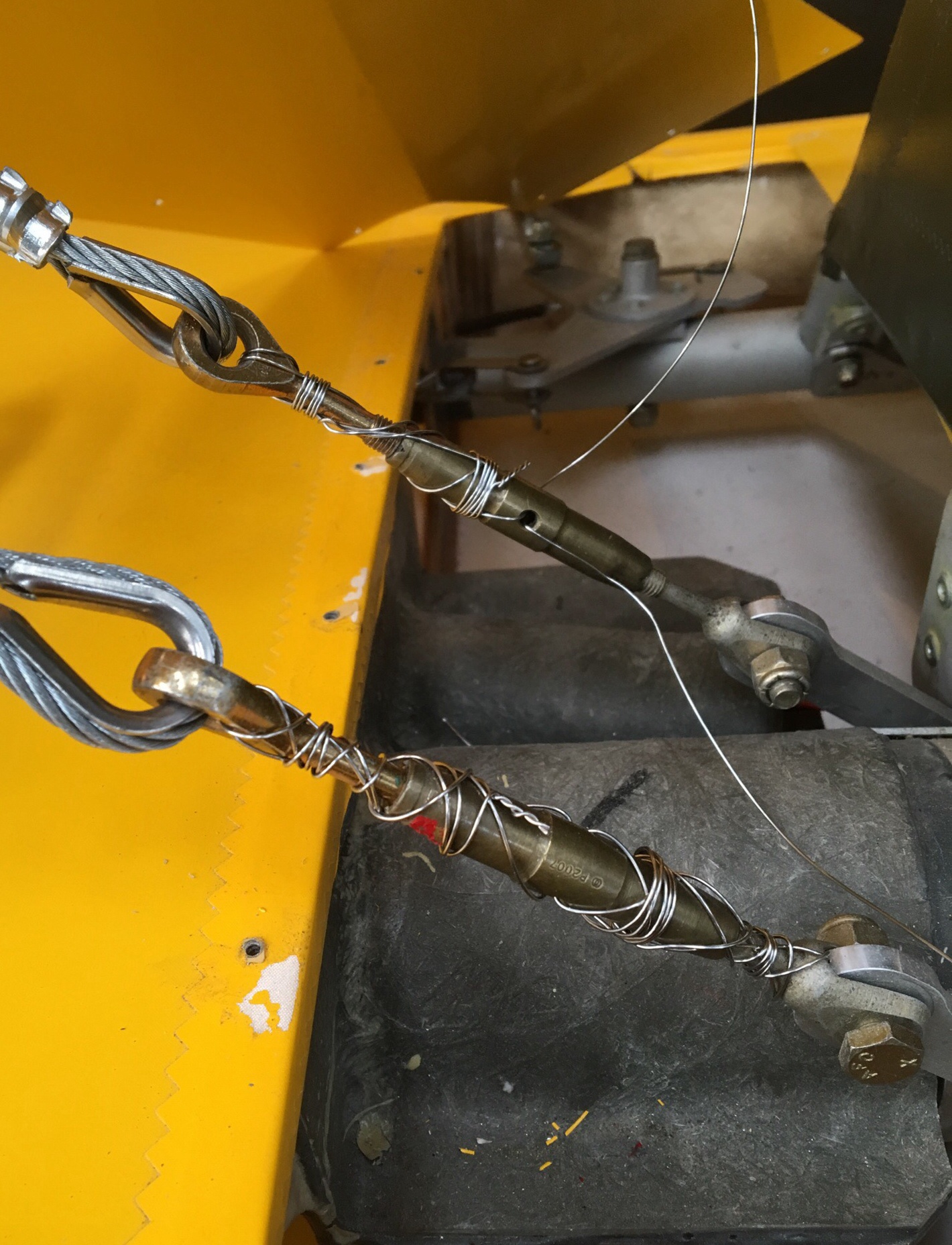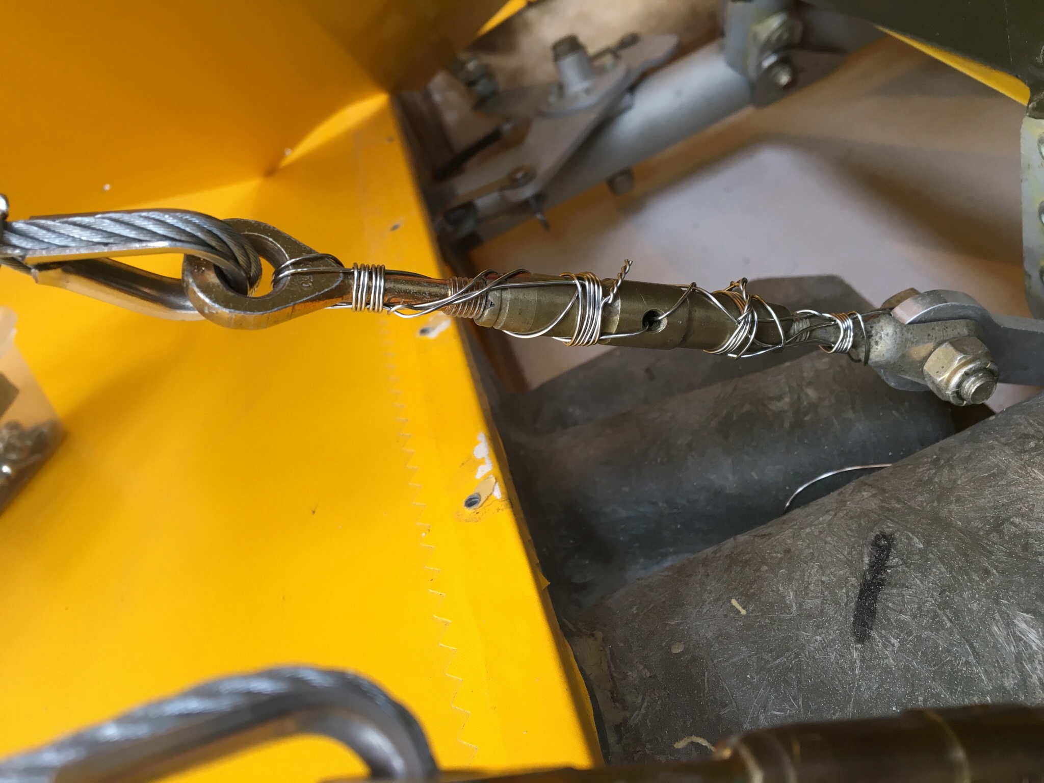 Using a double loop design in one of Graham’s American GA manuals … Although slightly more complex the 2 wires run in opposite directions and then tie over each other, lopping through the turnbuckle …