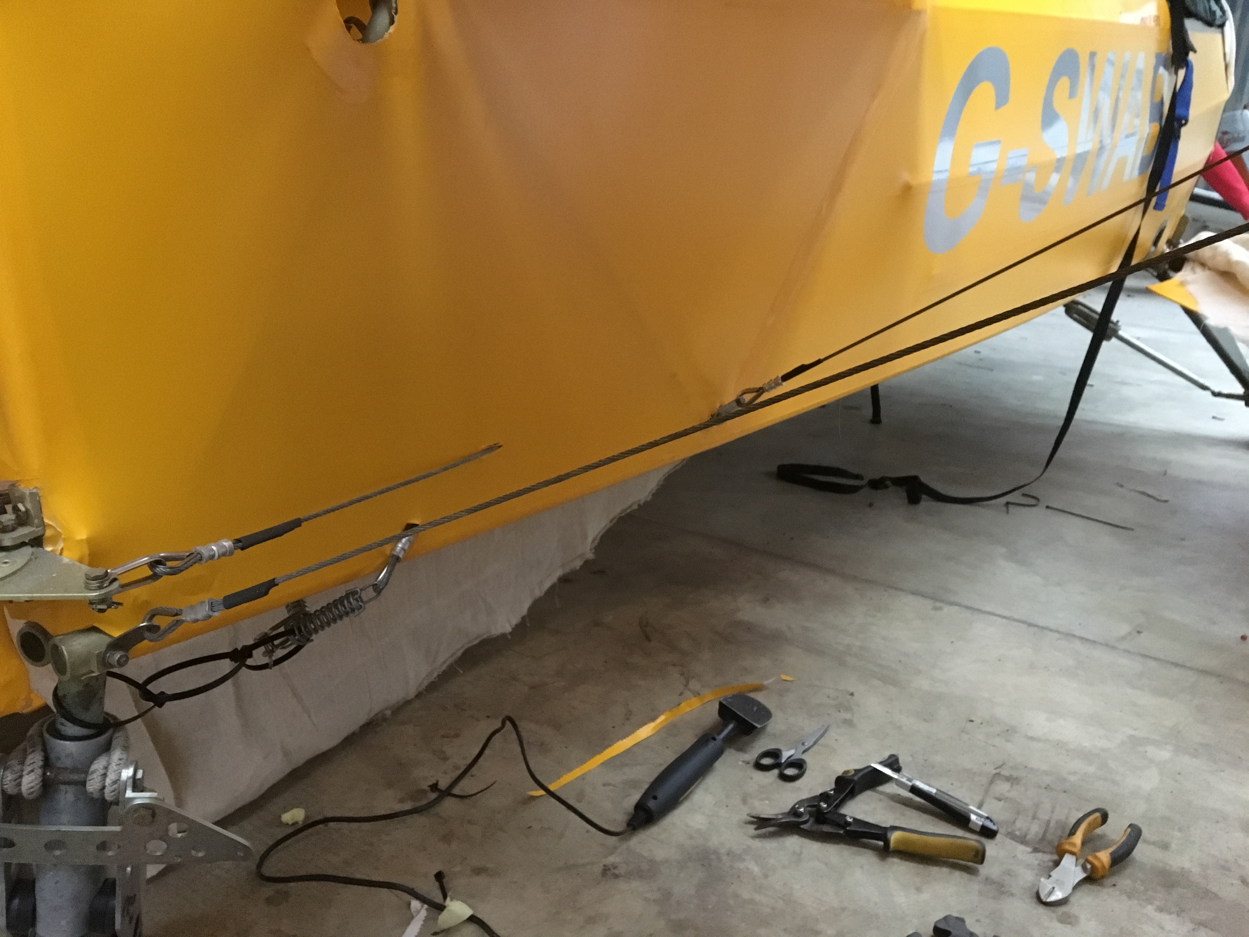 As the whole turtle deck downwards was covered in one continuous sheet I clearly didn’t want to recover ALL of that just because of the rear battery access. So I cut into the Oratex just rearwards of the 45 degree sloping alloy tube support … just rear wards of the “G” reg sticker in the picture above .. allowing about a 6” overlap.