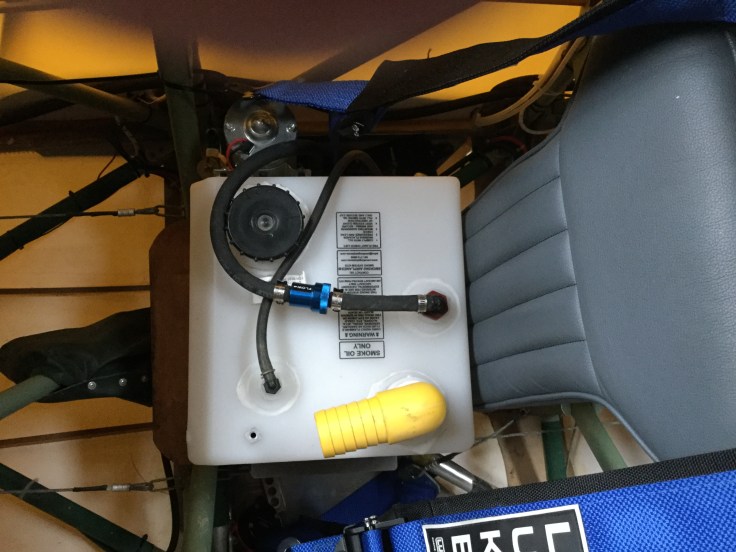 To mount the oil reservoir /tank I had originally intended on making a small rear shelf to sit behind the pilot seat P1 – rear, and span the sides of the fuselage … secured with proper aviation bolts. There was also a rear fill easy access, including an overflow drain pipe that exited well clear of any part of the airframe underneath the pilot seat.