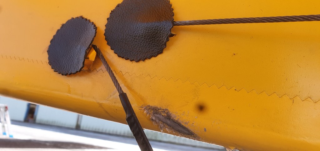 it turns out that prolonged full left rudder turns over the 3 years plus has caused the cable .. that splices off the rudder cable to give left and right control on the spring governed tailwheel … has rubbed against the lower material covering.
