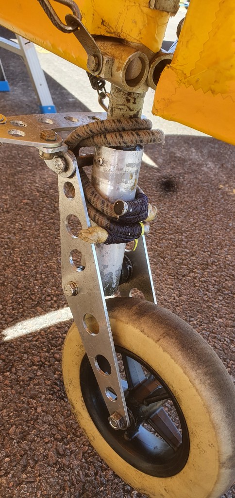 The oil had wet the tailwheel bungee rubber and then the ‘loop around’ had slipped up the tailwheel shaft and popped onto the (smaller diameter) main shaft. This had the effect of slacking the support .. hence allowing the natural resistance of the bungee – Now gone – to let the wheel have more free movement.