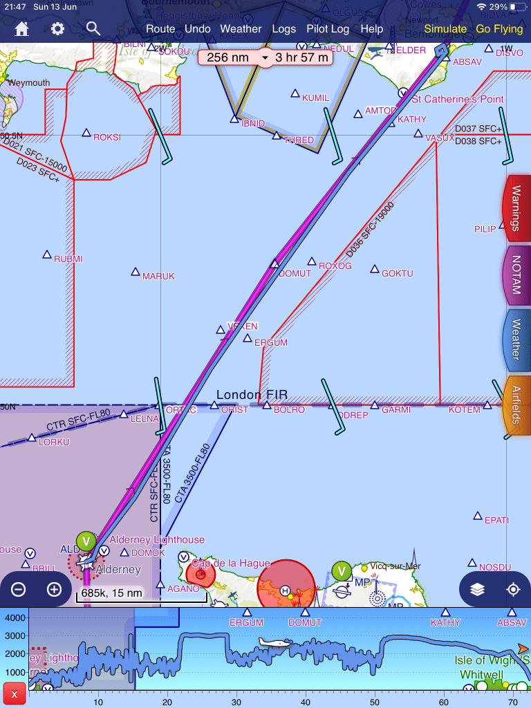 As expected … you become super sensitive to noises …vibrations .. movements .. and, with all that water around you long to see some sign of life .. the projected flight time cross channel was going to be around 1 hour 30 … and I’ve flown enough times over the Channel to know it can be 4kts each end and around 30 in the middle ! I had set myself a midway point (DOMUT) which was 39 miles from Alderney and 30 from Sandown .. the idea being .. if it took me disproportionally longer to get to DOMUT than I’d estimated .. then I would have a hard turn point to GO BACK with reserves