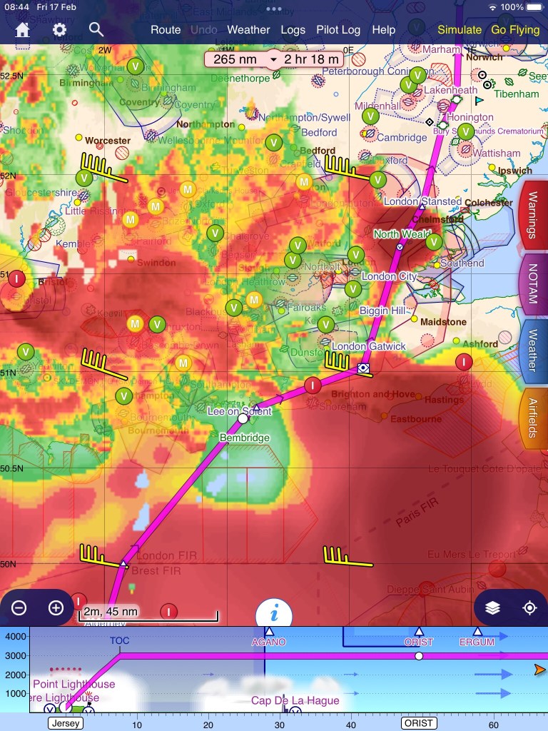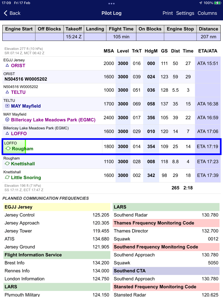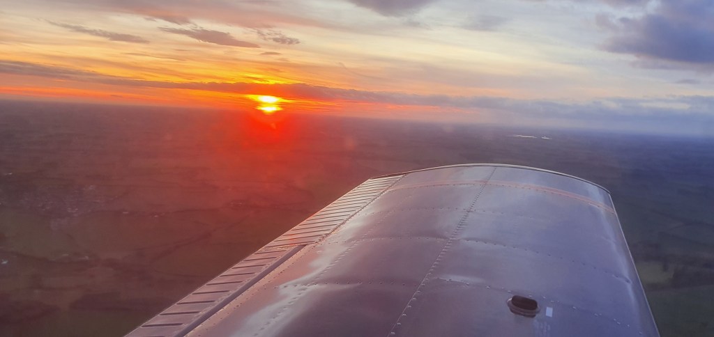 Eventually I taxied back and shut down .. and sat in the aircraft as it was clearly going to be a short window if indeed it DID open up. I watched the TAFs come and go … and still no luck … my problem now was that the planned 2 hr 19 min flight was dependant on hefty cross,tail winds and this all bound by a sunset in Norfolk of 17:11 .. meaning night officially 30 mins later at 17:41 ..so my absolute drop dead time for leaving was 15:15 … Eventually the patience paid off and tower called me on one of the times I had switched the radio on to hear the ATIS 134.80 SCT 300, BKN 600, BKN 1800 … we’re OFF !