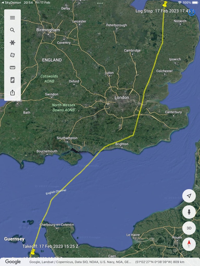 The fog was a little slow to clear and pre fuelling (to the top of both tanks) meant departure was about 10:00 local. Backtracked down the tarmac to the grass of threshold 25 … around a couple of pheasants !… and climb away above the mist into a lovely clear layer. Calling Norwich at 1,600’ to make sure I could get good 2 way comms … but they advised they couldn’t open my flightplan…and I’d have to ask London