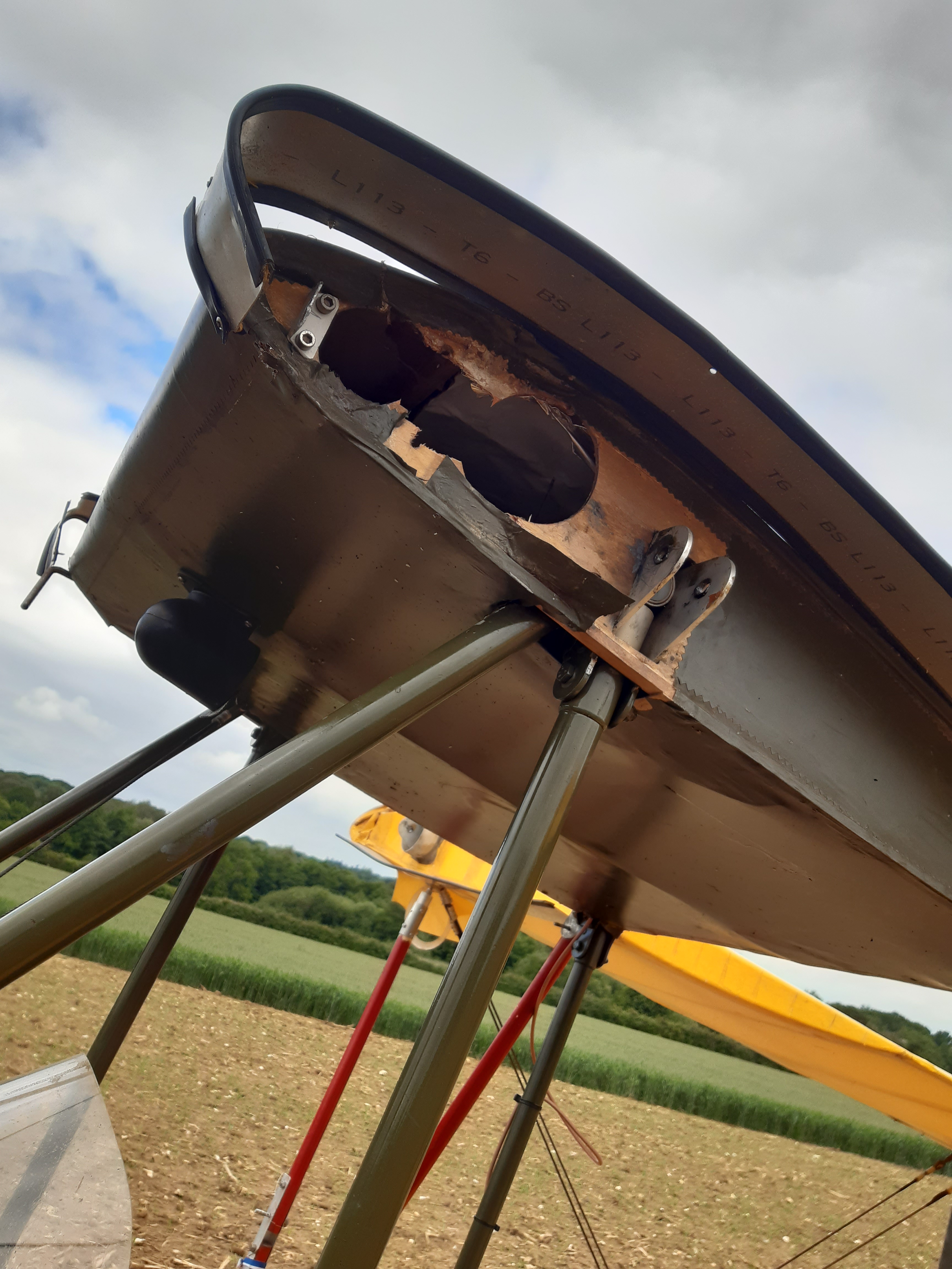 The wing pegs have alloy guide brackets which are bolted to the ply inboard ribs on the cabane … the ‘arrival’ and tip meant these took a rearward force that broke the ply and dissipated most of the energy