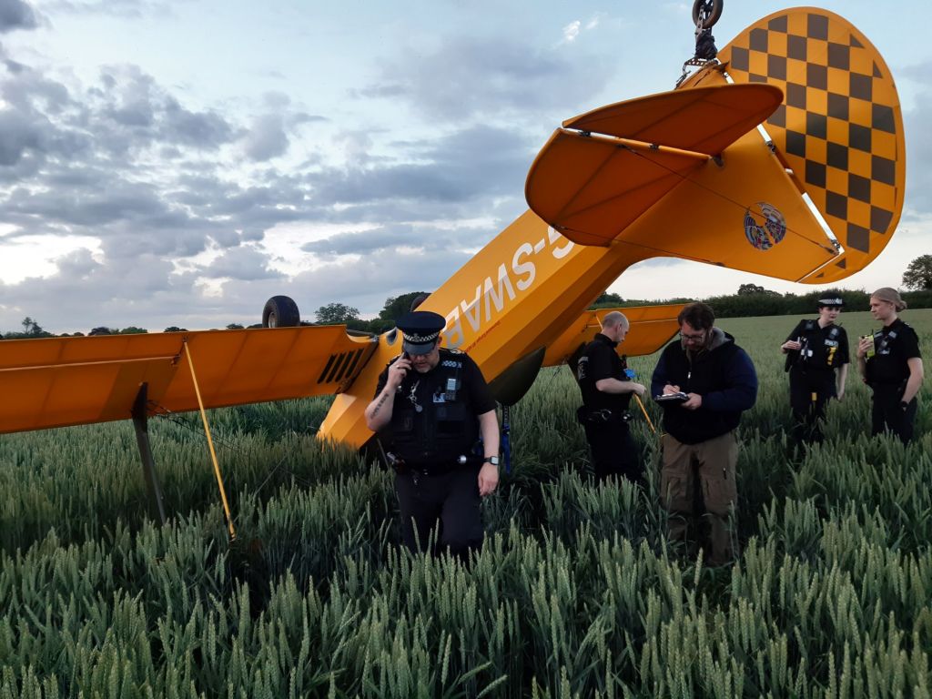 The fire brigade stood down as it was slowly draining what fluids were left into the field… the paramedics stood down and that just left the Police .. this was their FIRST downed aircraft .. to take photos and liaise with the Air Accident Investigation Bureau AAIB .. who, after about 1 hour 45 approved us to move the aircraft