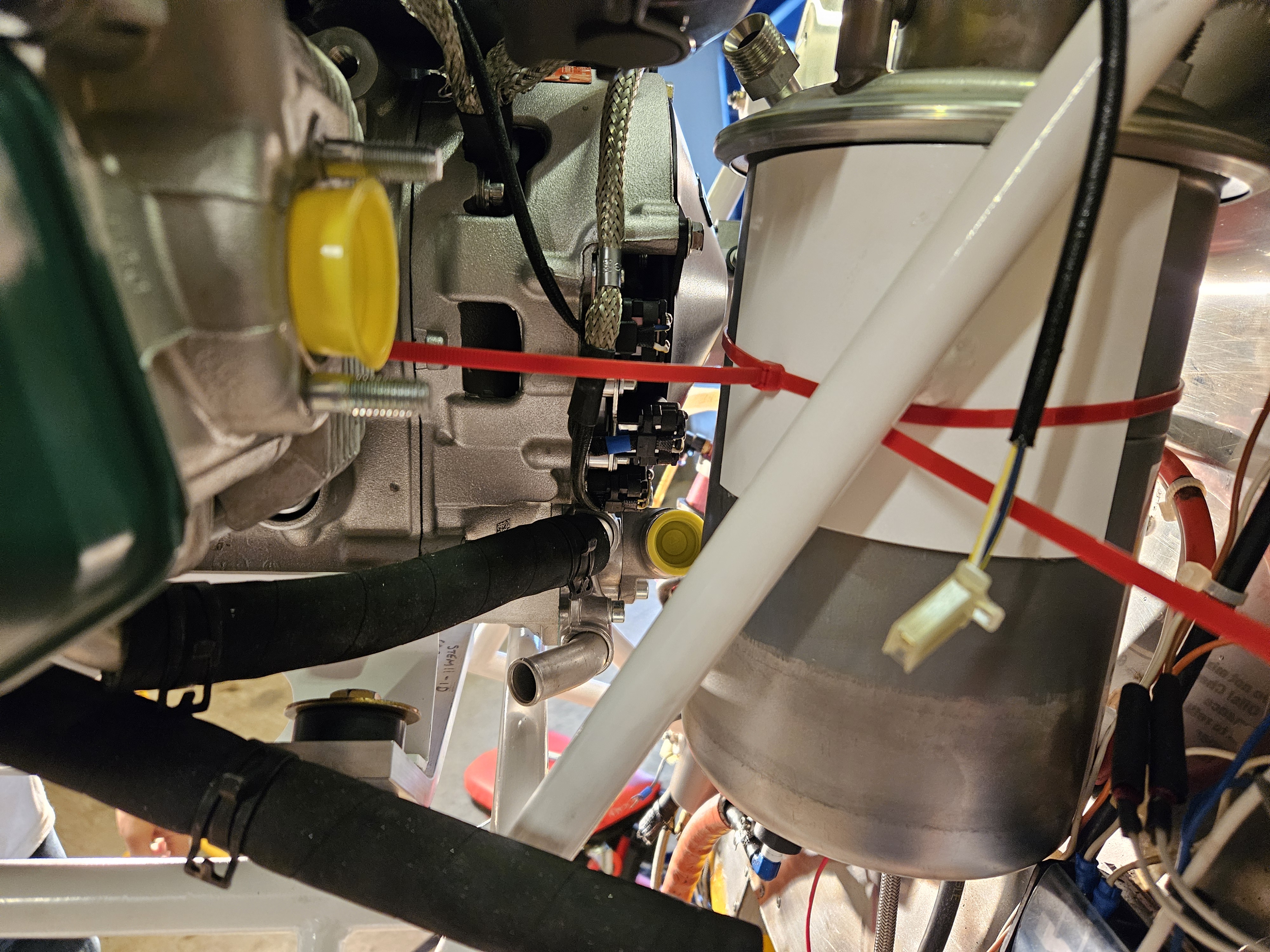 One thing I wanted to check was if the large oil cooling cylinder would fit. The securing ring was released and the chamber offered up from below and then reintroduced the top pieces in situ. Fitted a treat and was held (temporarily) in place with an extended cable tie pending sourcing suitable long jubilee steel straps.