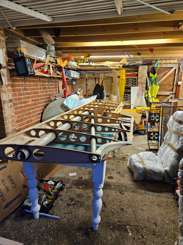 Having had the repaired wing back for a few weeks I have had time to replace aileron mounts, prep the bare wood (repaired) sections and add new rear strut support mounts, it was time to remove the wing (Port Upper) and drive it home.