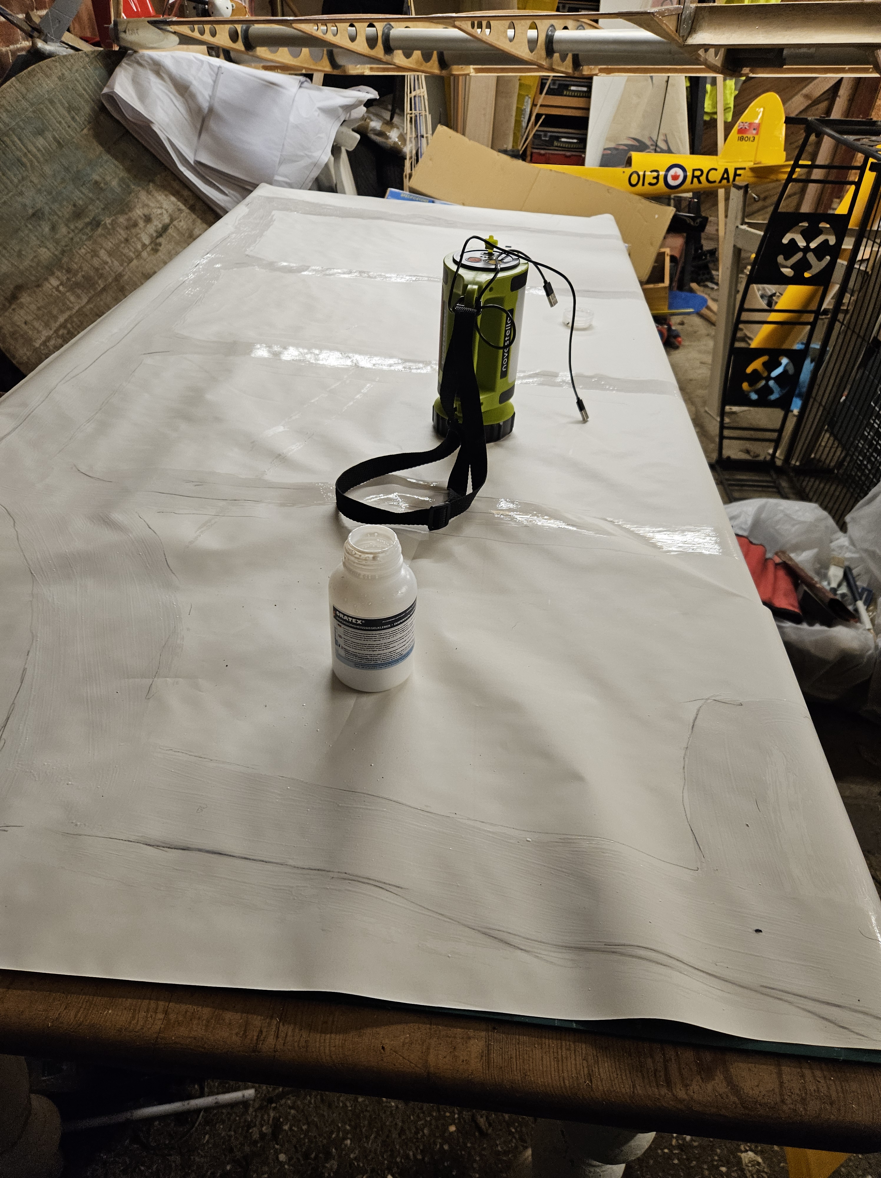 Safely in the garage, I could finish off the material landing plates where the glue had eased out and present some new Cub Yellow Oratex up to mark up the undersurface of the material where Oratex glue needed to go.