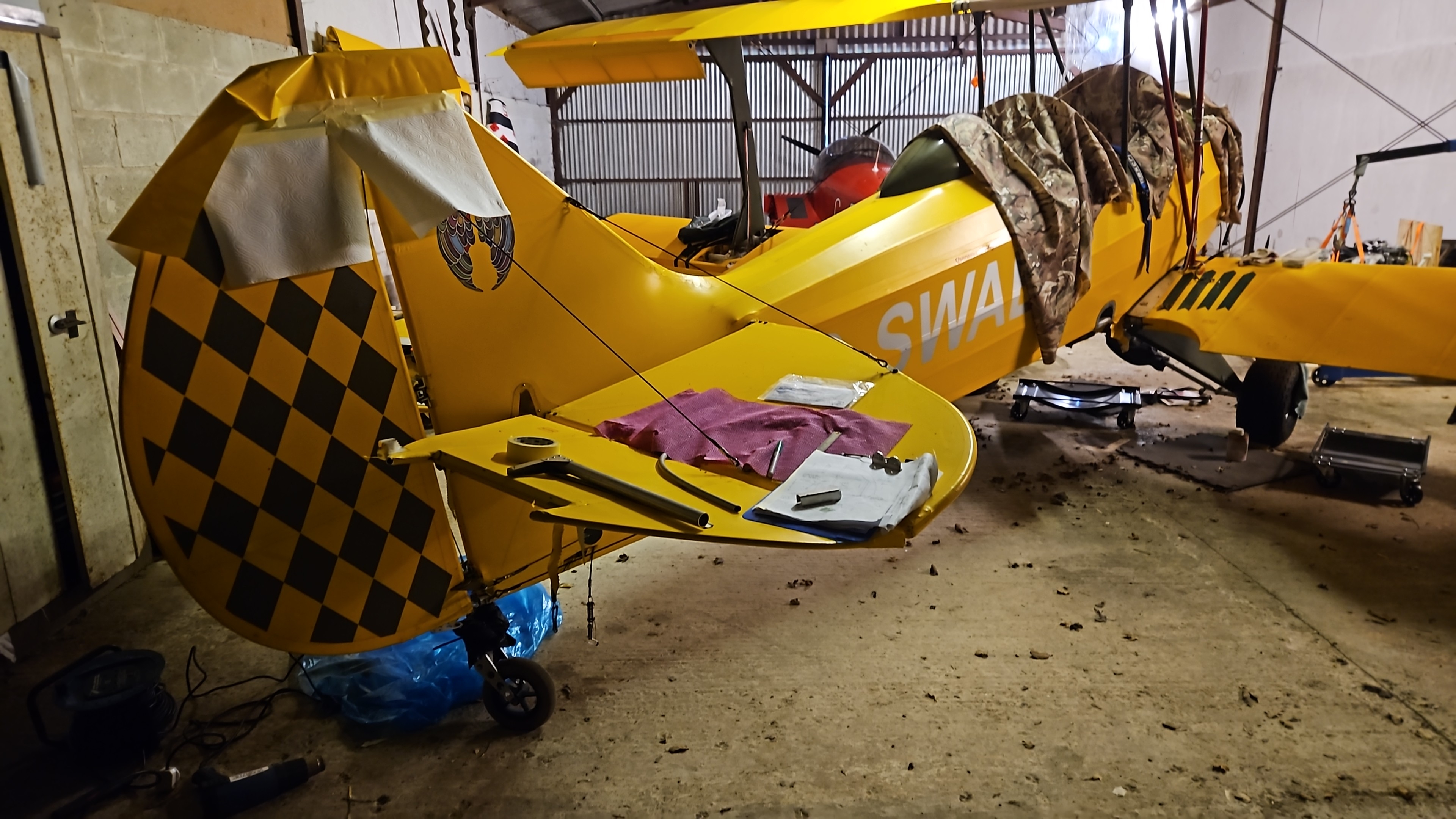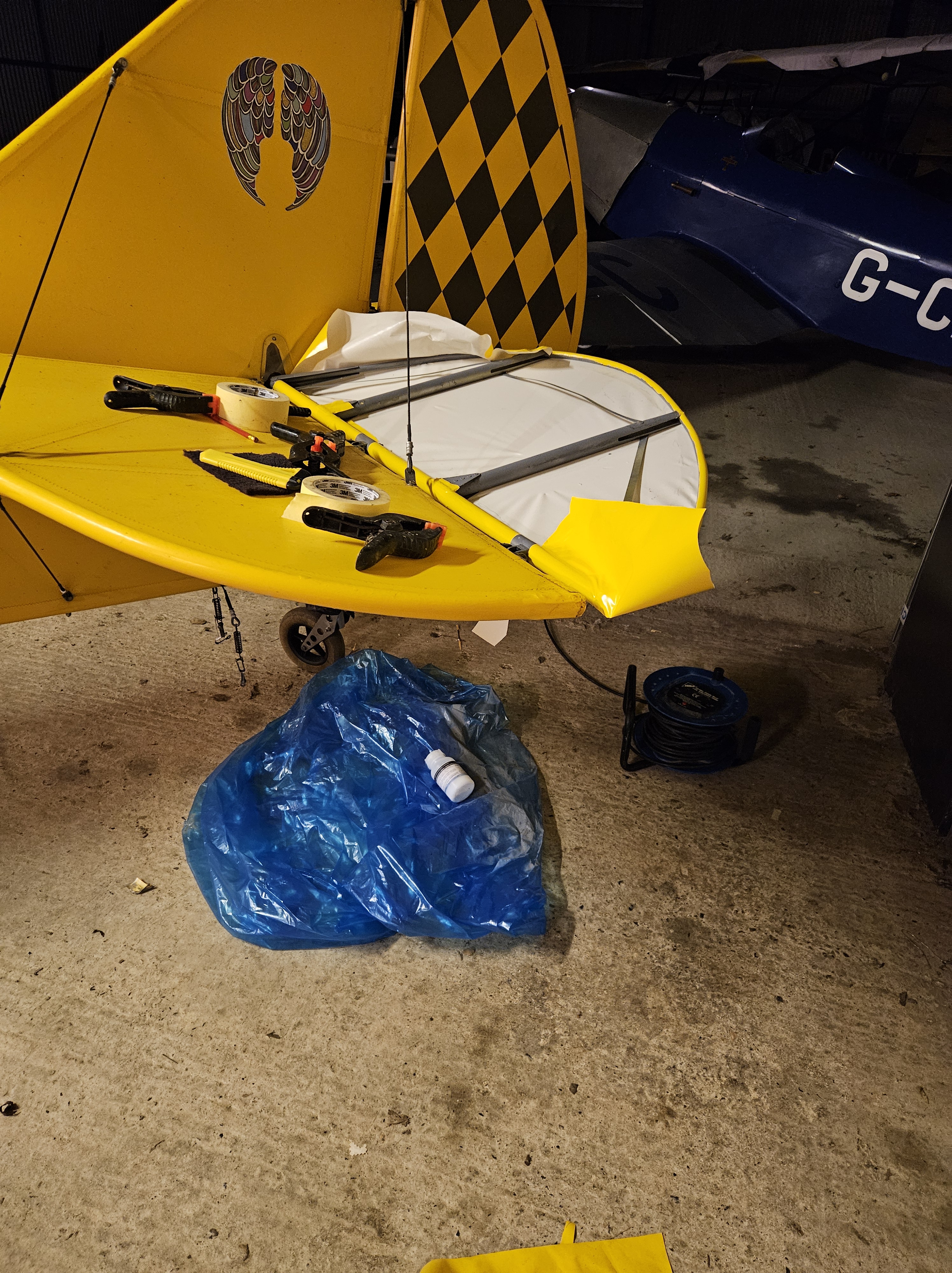 The port elevator was part that got the material scraped in the hoist recovery…trying to repair the scuffed material was proving a bit tricky so decided to strip and recover. At last the ambient temperatures have risen above freezing so allowing gluing to continue.