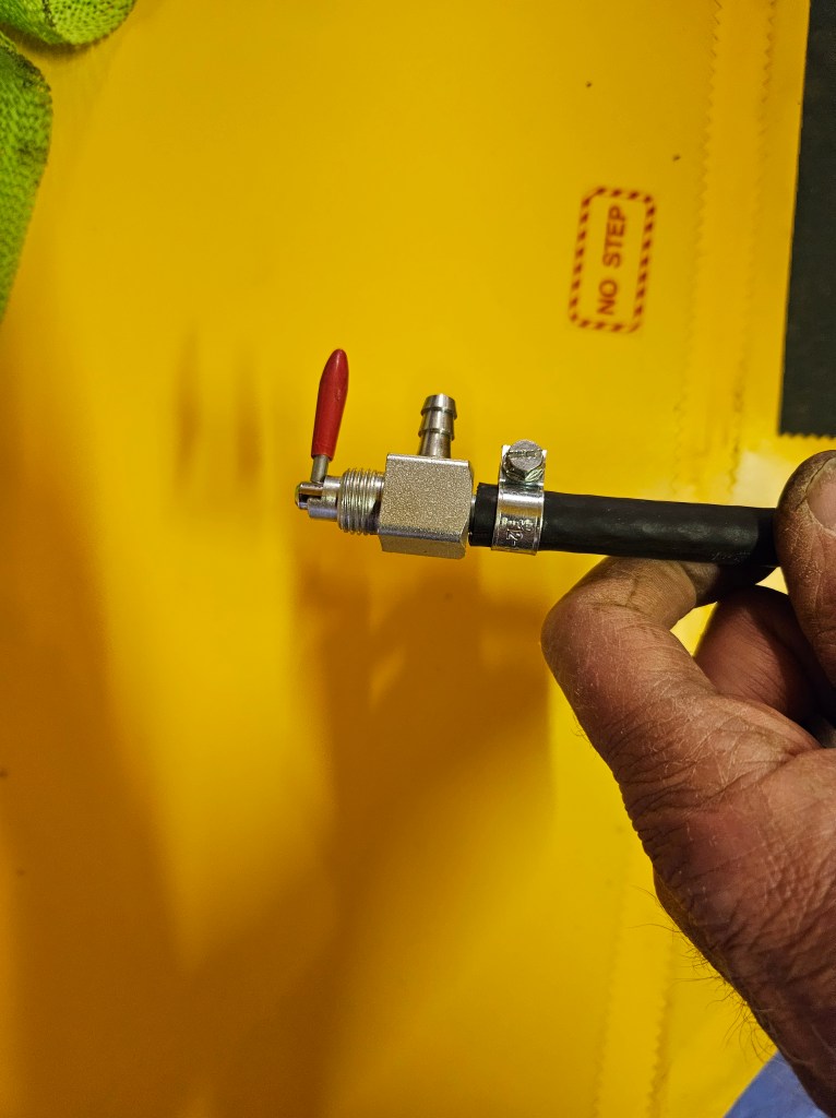 The feed from the upper tank is via a short piece of rubber fuel tubing to a ‘cut to length’ alloy tube that runs down one of the rear cabane arms and the connects to a small piece of rubber tube to the Valve selector.