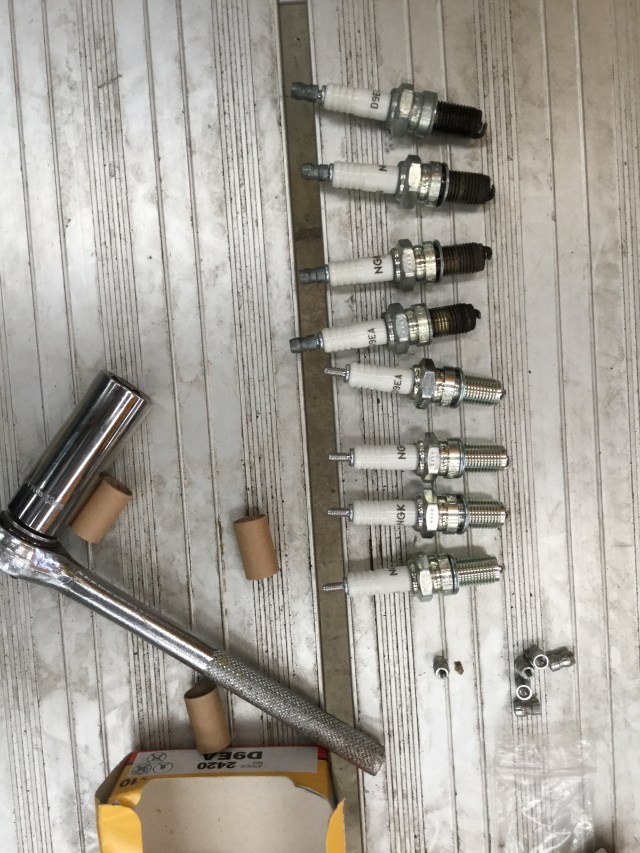 Next will be the distributor caps, rotor arms and all 8 spark plugs. I checked the plugs around 4 hours ago and they all had the good healthy brownish tinge to them showing they were burning well.